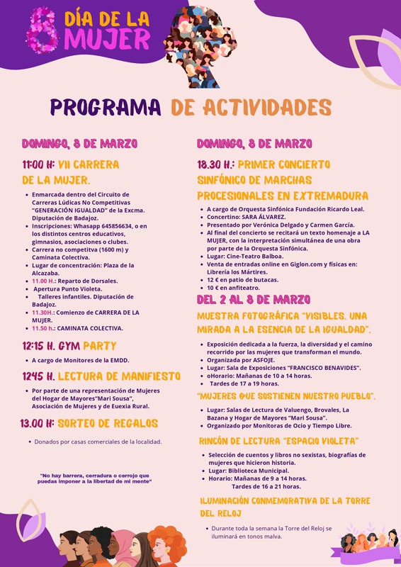 El domingo, Día Internacional de la Mujer, la Plaza de la Alcazaba será escenario de partida, a las 11.00 horas, de la VII Carrera de la Mujer, enmarcada en el circuito de carreras no competitivas ‘Generación Igualdad’ de la Diputación de Badajoz. La cita contará con talleres infantiles y culminará con una caminata colectiva que dará paso a una ‘Gym party’ y a la lectura de un manifiesto por el 8 de Marzo a cargo de mujeres socias del Hogar de Mayores ‘Mari Sousa’, la Asociación de Mujeres Progresistas ‘Felisa Tanco’ y ‘Euexia Rural’.
