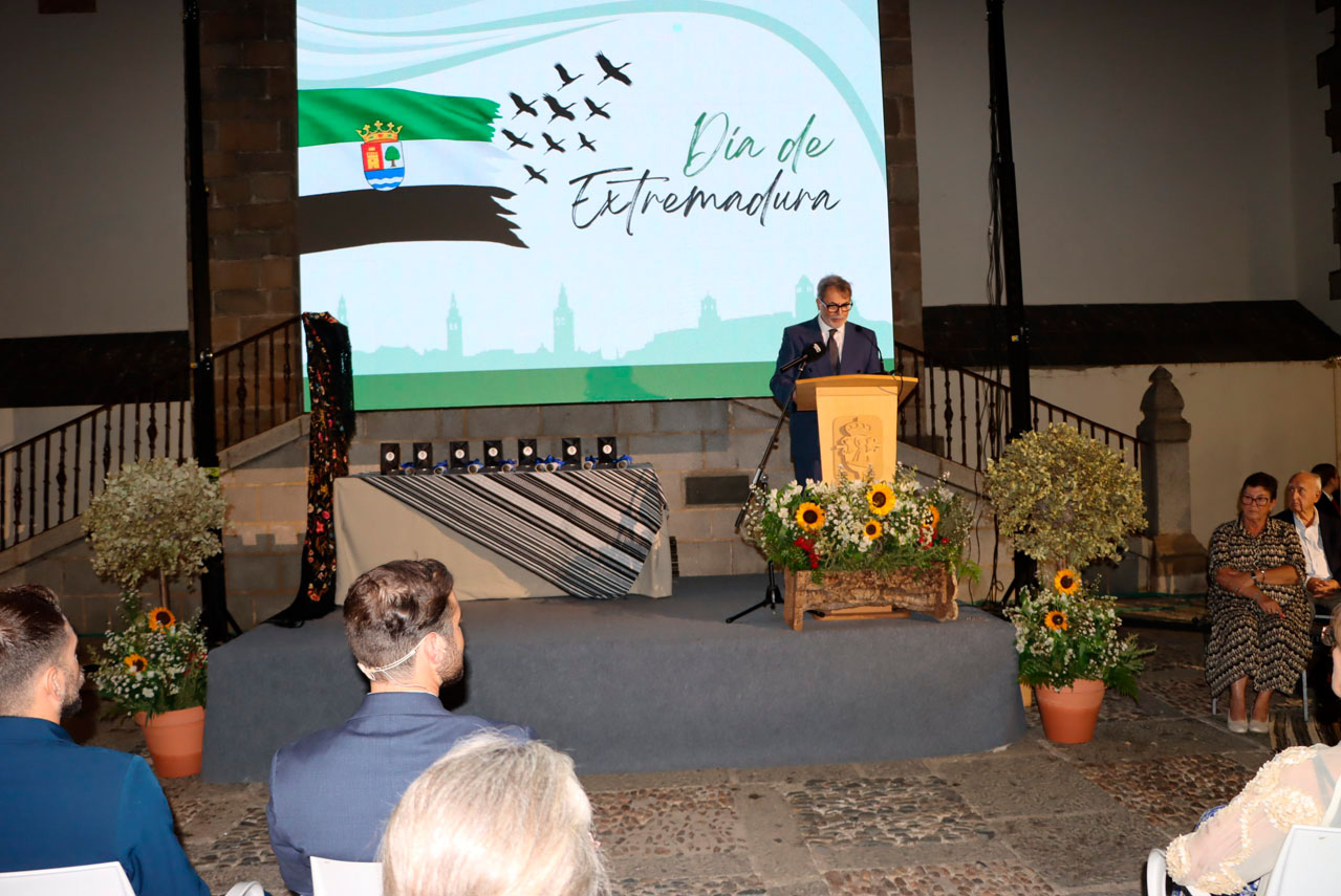 La Plaza de España ha sido escenario esta noche de los actos de celebración del Día de Extremadura, una cita que ha servido de marco, nuevamente, para reconocer a personas y colectivos de Jerez de los Caballeros que han destacado por su labor y trayectoria en distintos ámbitos de la vida de esta ciudad, poniendo de relieve la unidad, la solidaridad y el compromiso con lo común, valores que el alcalde, Raúl Gordillo, ha destacado como pilares del desarrollo de esta ciudad junto al diálogo.