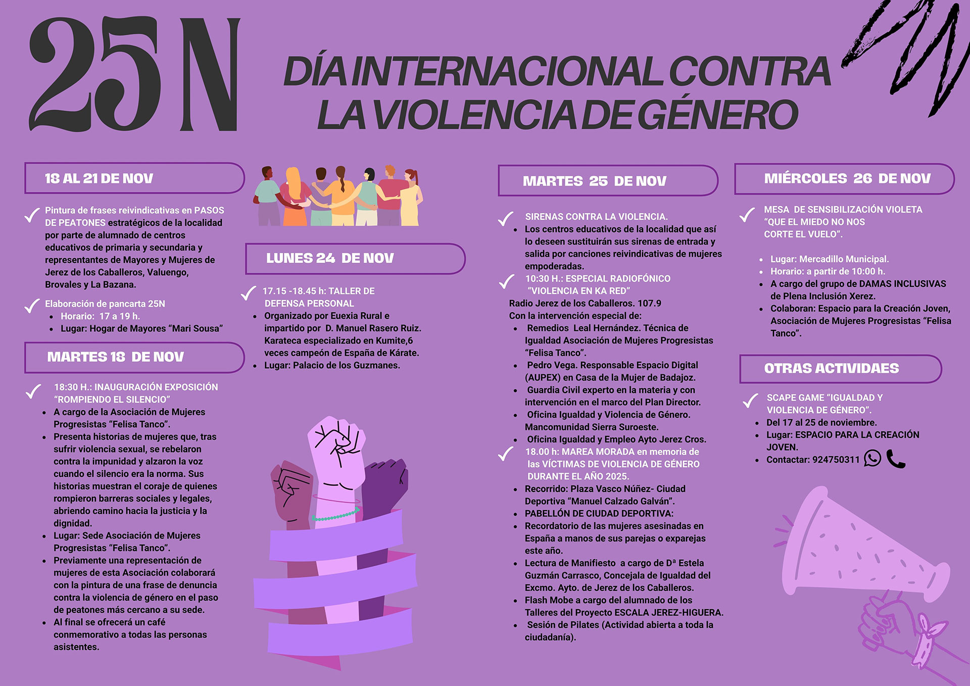 El miércoles, 26 de noviembre, se ha organizado una ‘Mesa de sensibilización violeta’ con el lema ‘Que el miedo no nos corte el vuelo’ que tendrá lugar en la zona del mercadillo municipal, a partir de las 10.00 horas, a cargo del grupo de ‘Damas inclusivas’ de Plena Inclusión Xerez. Mientras que el Espacio para la Creación Joven, también realizará un ‘Scape game’ del 17 al 25 de noviembre.
