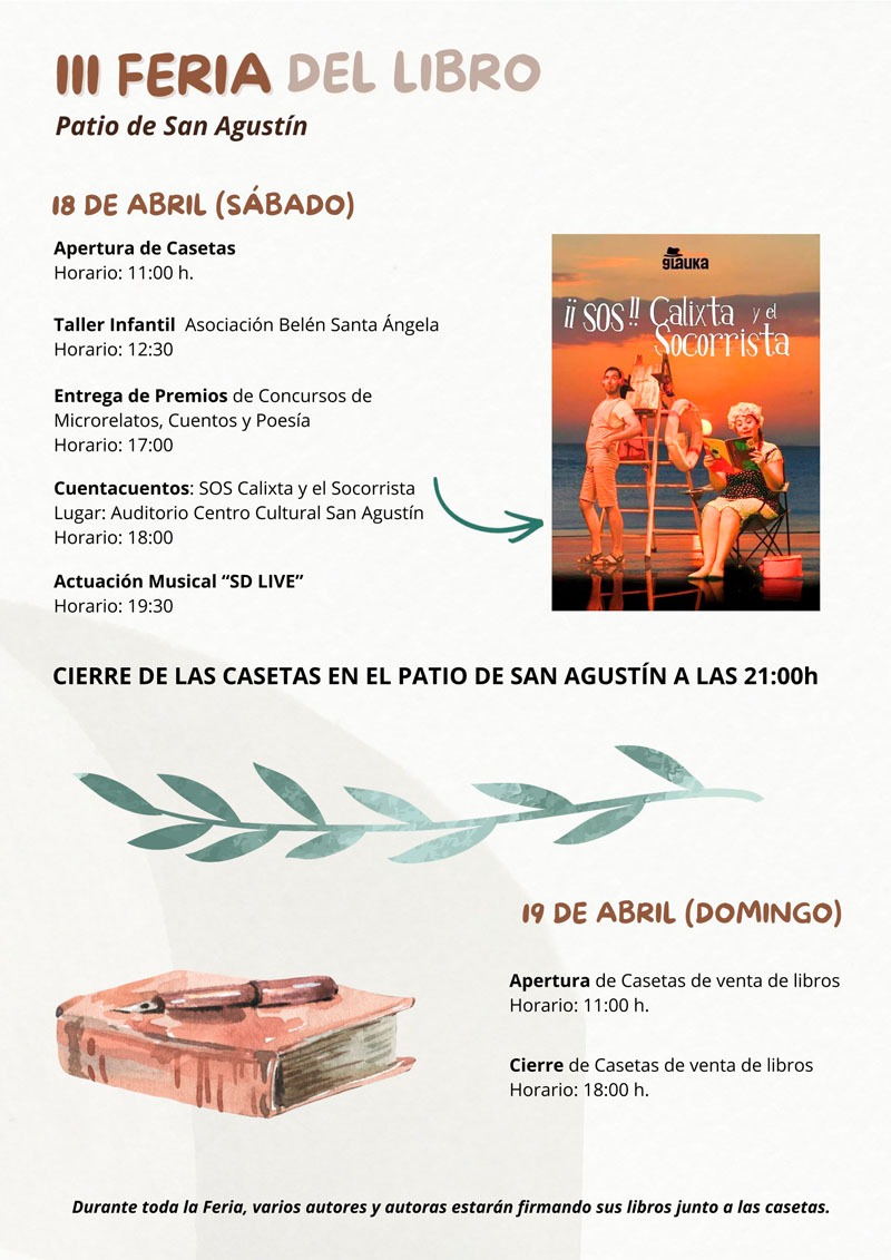La III Feria del Libro se celebrará los días 18 y 19 de abril con el Centro cultural San Agustín como escenario principal en el que se darán cita librerías y editoriales para la venta de libros, junto al desarrollo de otras actividades, a partir de las 11.00 horas y durante toda la jornada. El sábado, a las 12.30 horas, la Asociación del Belén ‘Santa Ángela’ llevará a cabo un taller infantil; a las 17.00 horas tendrá lugar la entrega de premios del Concurso de microrrelatos, cuentos y poesía para dar paso a continuación, al cuentacuentos ‘SOS Calixta y el socorrista’ y a la actuación musical de ‘SD Live’.