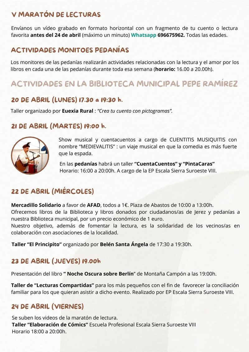 Para el miércoles, 22 de abril, está programado un mercadillo solidario a beneficio de la asociación AFAD Jerez Sierra Suroeste que tendrá lugar a partir de las 10.00 horas en la Plaza de Santiago, con la venta de libros a 1 euro. Ese mismo día, la Biblioteca ‘Pepe Ramírez’ acogerá también un taller sobre el libro ‘El Principito’, a las 17.30 horas, a cargo de la Asociación del Belén ‘Santa Ángela’.