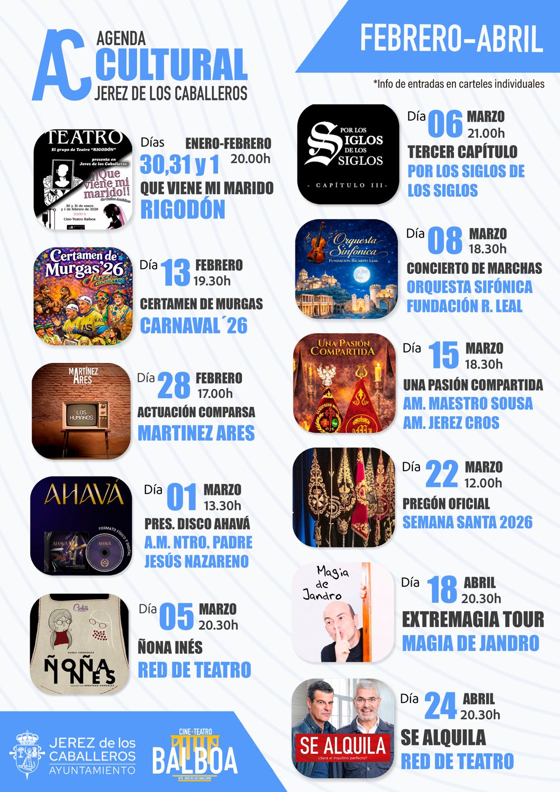 Méndez ha animado al público de Jerez, de sus pedanías y de toda la comarca a disfrutar de esta completa agenda cultural de la que se irá dando puntual información en cuanto venta de entradas para cada una de las citas.