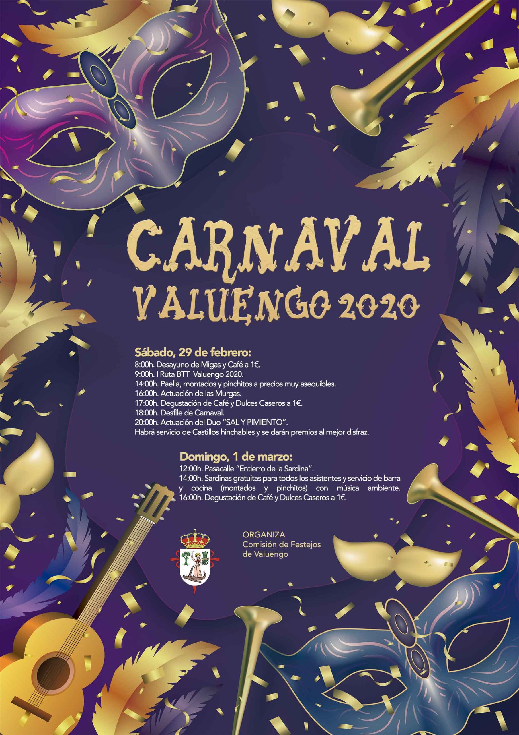 En Valuengo, el Carnaval comenzará el sábado a primera hora de la mañana, las 8 horas, con un desayuno consistente en migas y café al precio de 1 euro para dar paso a la celebración de la I Ruta BTT Valuengo 2020. A las 14 horas tendrá lugar una comida con: paella, montados y pinchitos, a precios asequibles y a las 16 horas, actuarán las Murgas. Para la sobremesa habrá café y dulces caseros al precio de 1 euro previo al desfile de Carnaval, a las 18 horas. Tras el mismo, a las 20 horas, tendrá lugar la actuación del ‘Dúo Sal y Pimiento’. Durante la jornada funcionarán castillos hinchables y se entregarán premios a los mejores disfraces. La celebración culminará el domingo con el pasacalle del ‘Entierro de la Sardina’, a las 12 horas y a las 14 horas, la degustación gratuita de sardinas asadas y, finalmente, café y dulces caseros al precio de 1 euro.